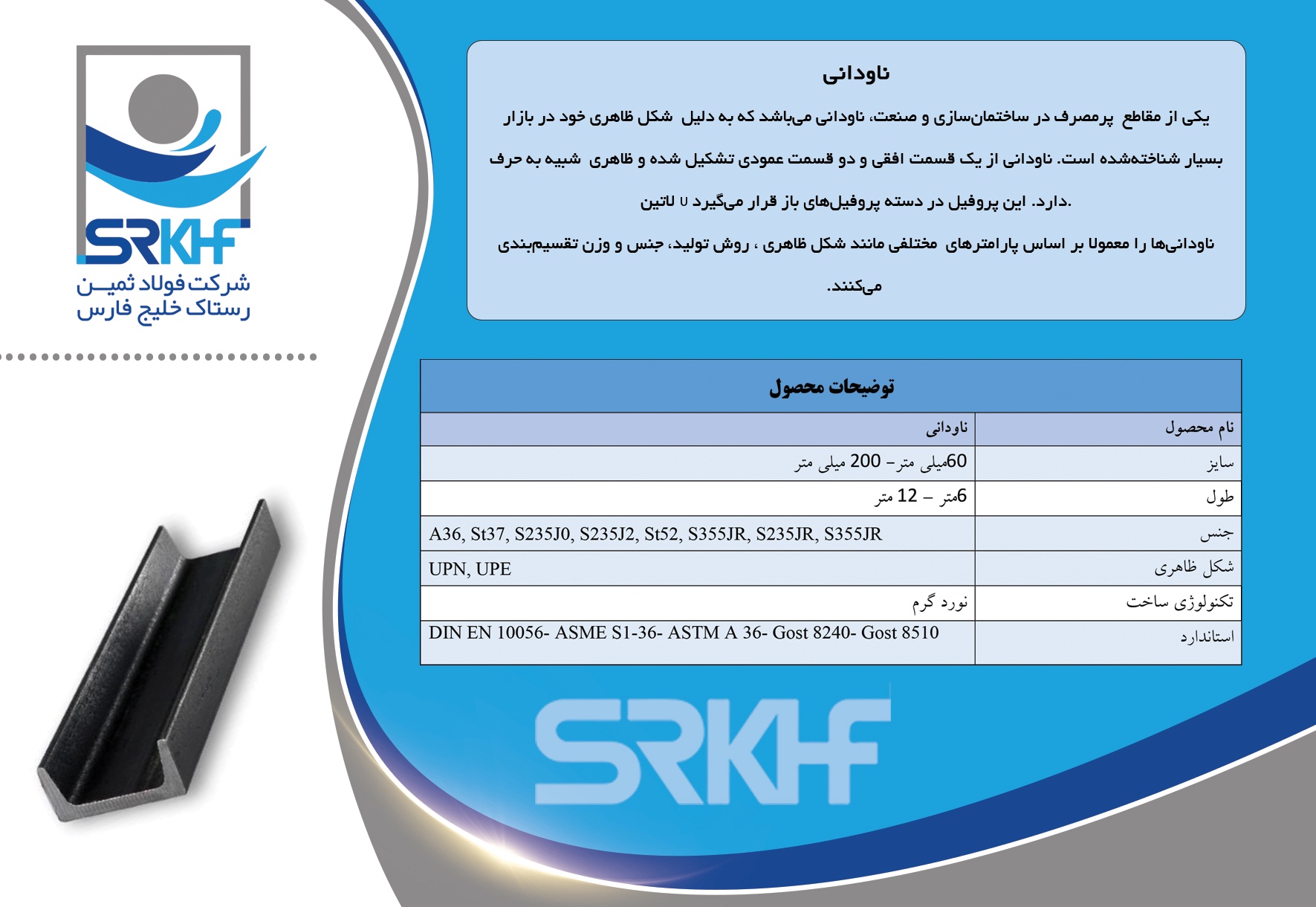 یکی از مقاطع  پرمصرف در ساختمان‌سازی و صنعت، ناودانی می‌باشد که به دلیل  شکل ظاهری خود در بازار بسیار شناخته‌شده است. ناودانی از یک قسمت افقی و دو قسمت عمودی تشکیل شده و ظاهری  شبیه به حرف لاتین U دارد. این پروفیل در دسته پروفیل‌های باز قرار می‌گیرد.